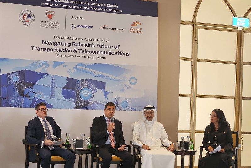 Dr Abdulla bin Ahmed Al Khalifa, the Minister of Transportation and Telecommunications, Wael Zaoud, Managing Director, Boeing Qatar, Matthew Luckhurst, CEO and Managing Director, APM Terminals Bahrain and moderated by Zahraa Taher, Board Secretary AmCham Bahrain